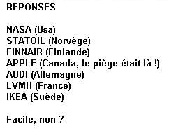 NASA– STATOIL – FINNAIR– APPLE – AUDI – LVMH – IKEA / Voir les réponses en cliquant ici !